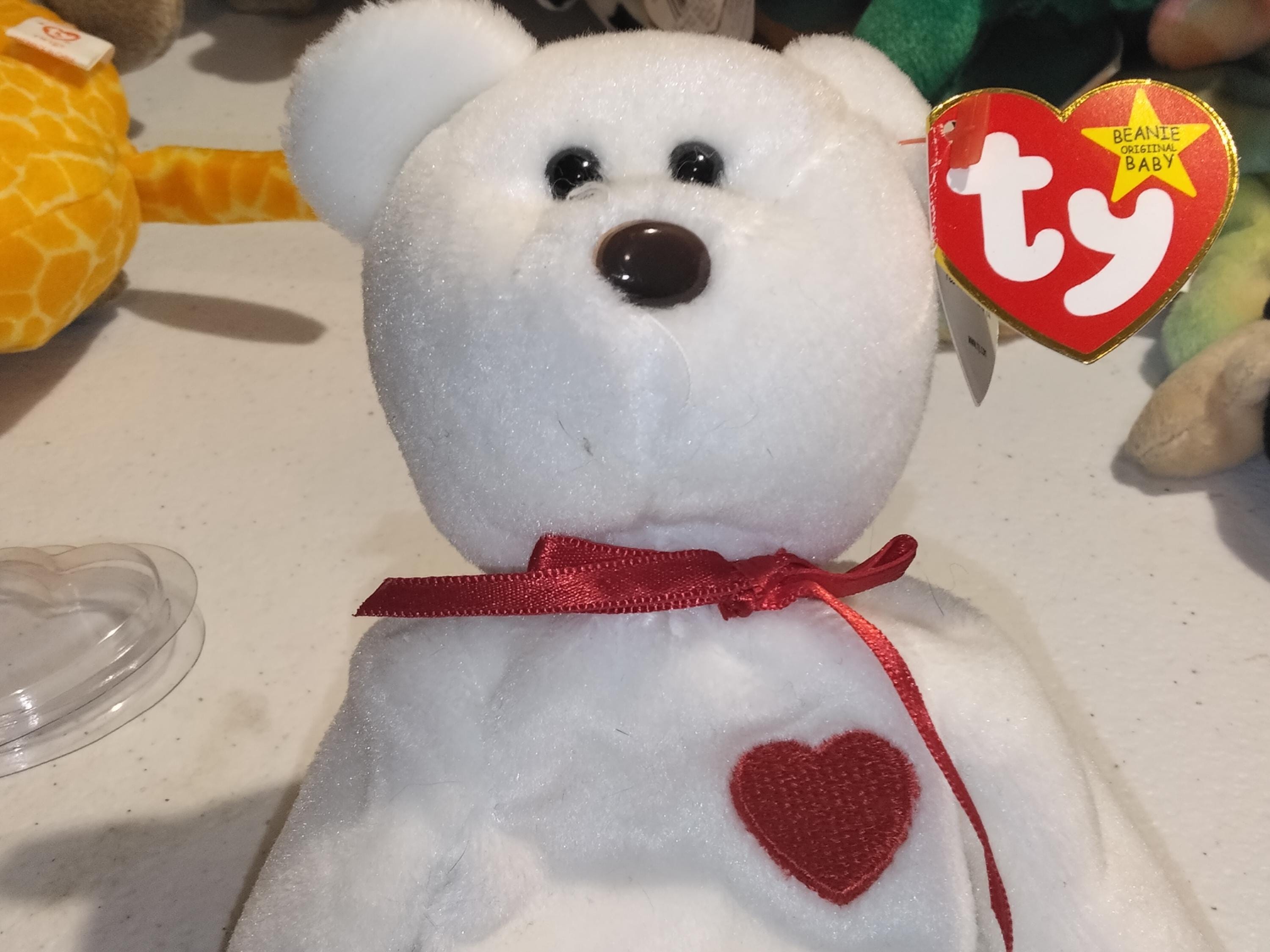 TY Beanie Babies Valentino The Valentine's Day White Bear With Hangtag Errors "Origiinal" And "Suface"; P.E. Pellets, MWMTs.