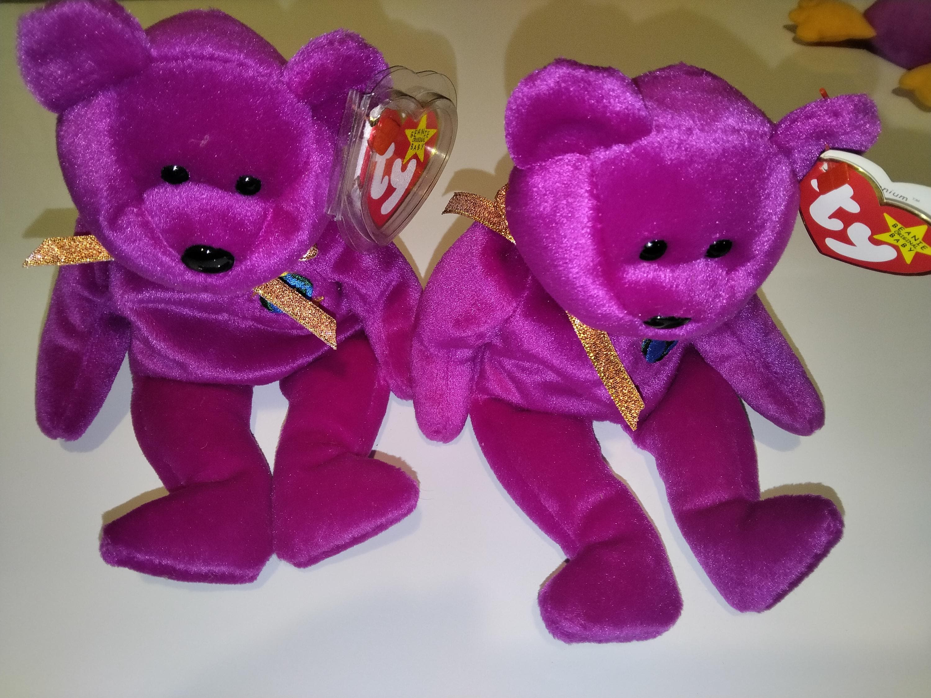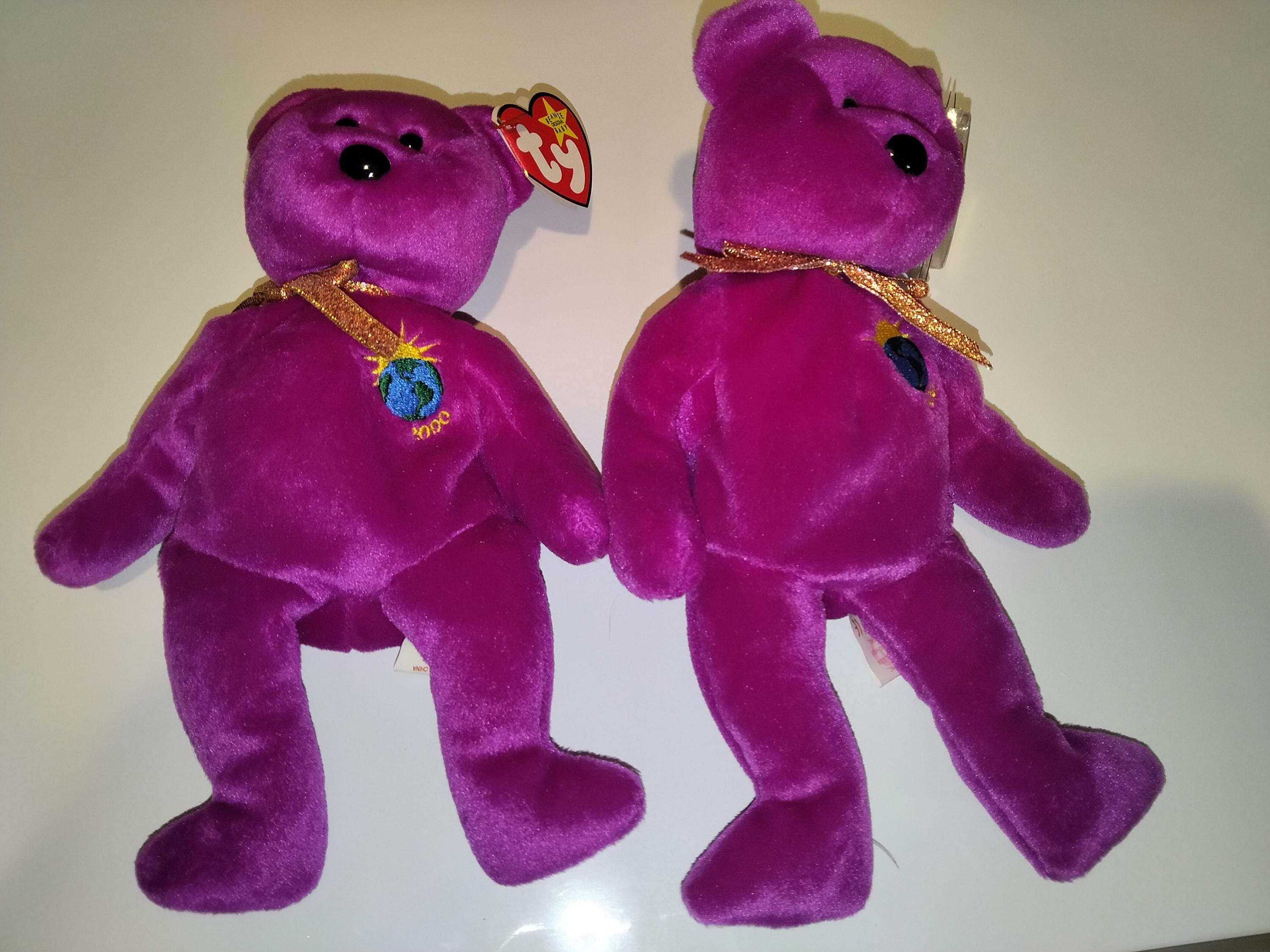 Ty Beanie Babies Millennium/Millenium The Purple Bear 2pc Set, One with misspelled Tush Tag, Also 'Gosport" Misspelled 'Gasport' On That One