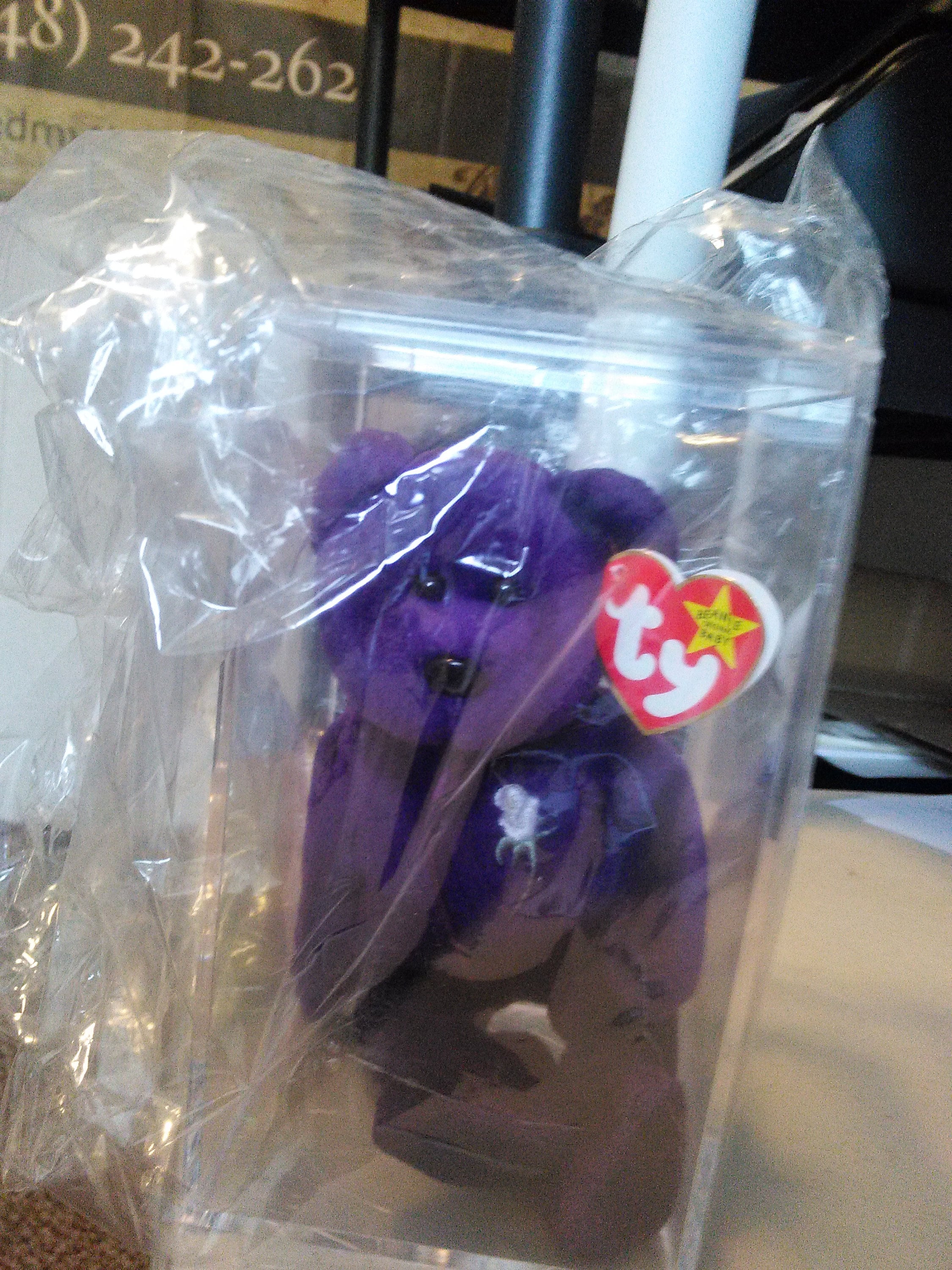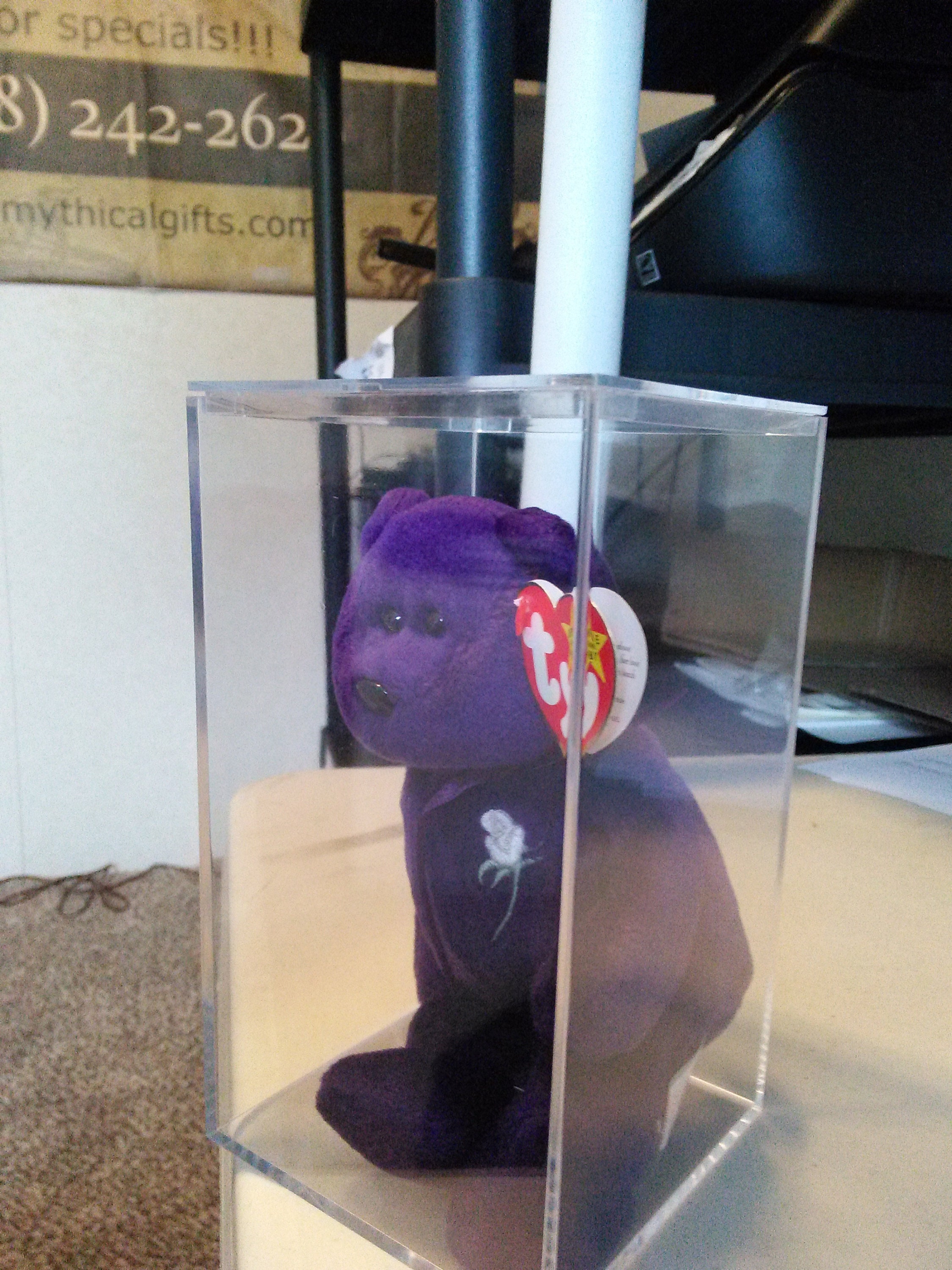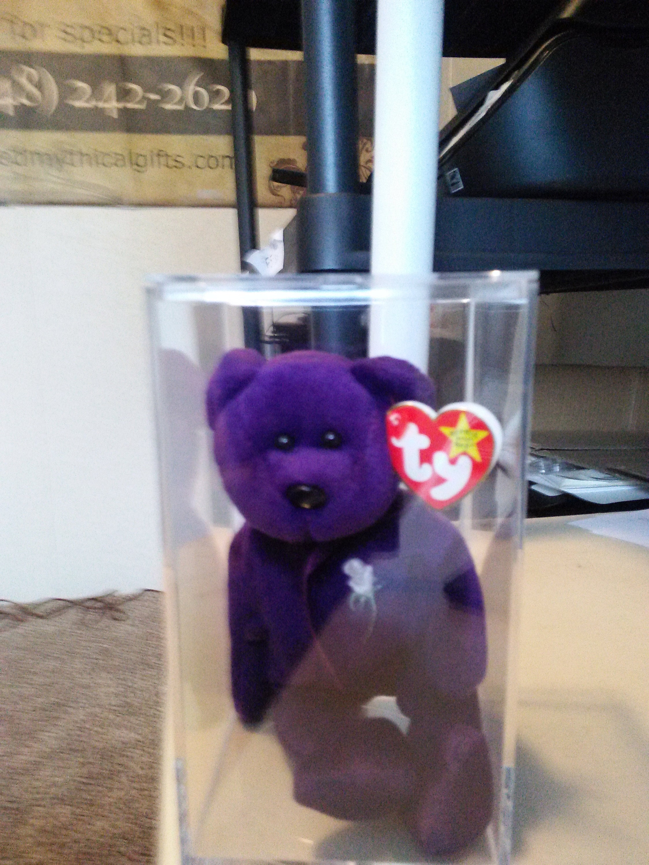 This is your chance to own one of the most popular and highly sought after beanie babies of all time. This is Princess, the beanie baby named after the late Princess Diana. This bear is a deep, rich purple color, and absolutely MINT. There are no stains, odors, or tears on this beanie. Princess is mint, with both of her tags being mint as well. Princess will come with an ear/hang tag protector, and in an Acrylic case for all of your friends and loved ones to see and to cherish. Princess can be shipped anywhere in the world, and she is ready to ship today. I've got 10 of these Princesses, and these are P.E. pellet filled.. This would be a perfect gift for Christmas as well!